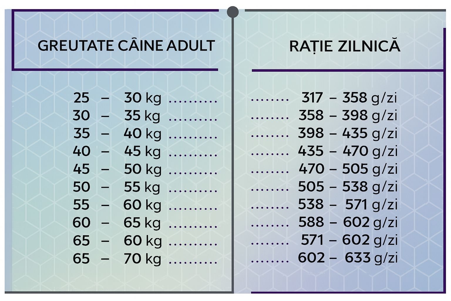 Instructiuni de hranire: Serviti mancarea uscata. Asigurati-va ca apa curata si proaspata este disponibila in permanenta. Consultati tabelul de hranire pentru cantitatile orientative si adaptati-le in functie de nevoile individuale ale cainelui dvs.