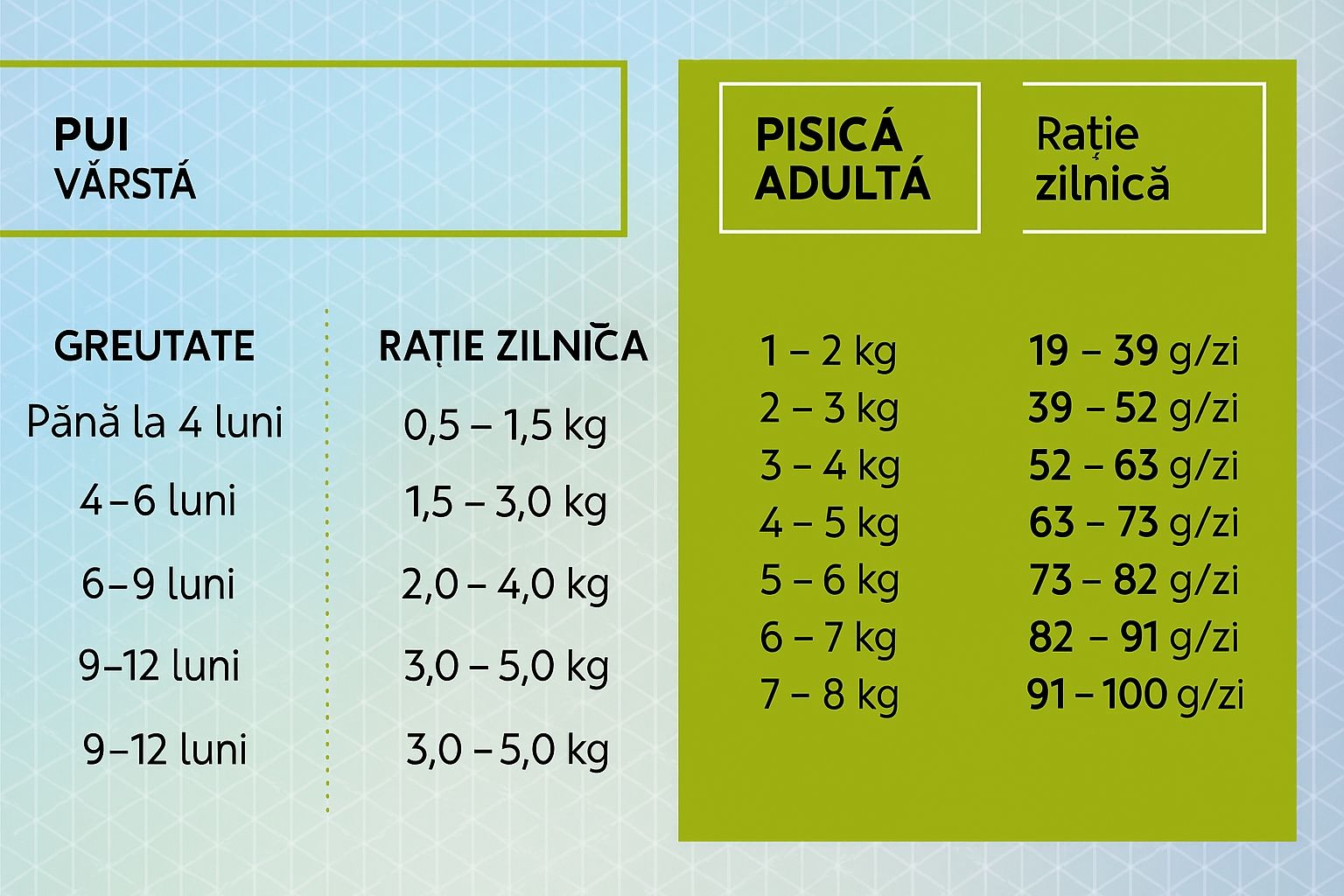 Verificati tabelul de pe ambalaj pentru orientare. Cantitatile pot varia in functie de varsta, greutatea si nivelul de activitate al pisicii tale.